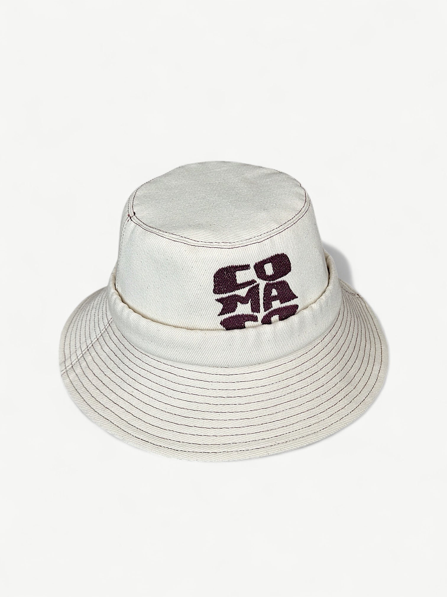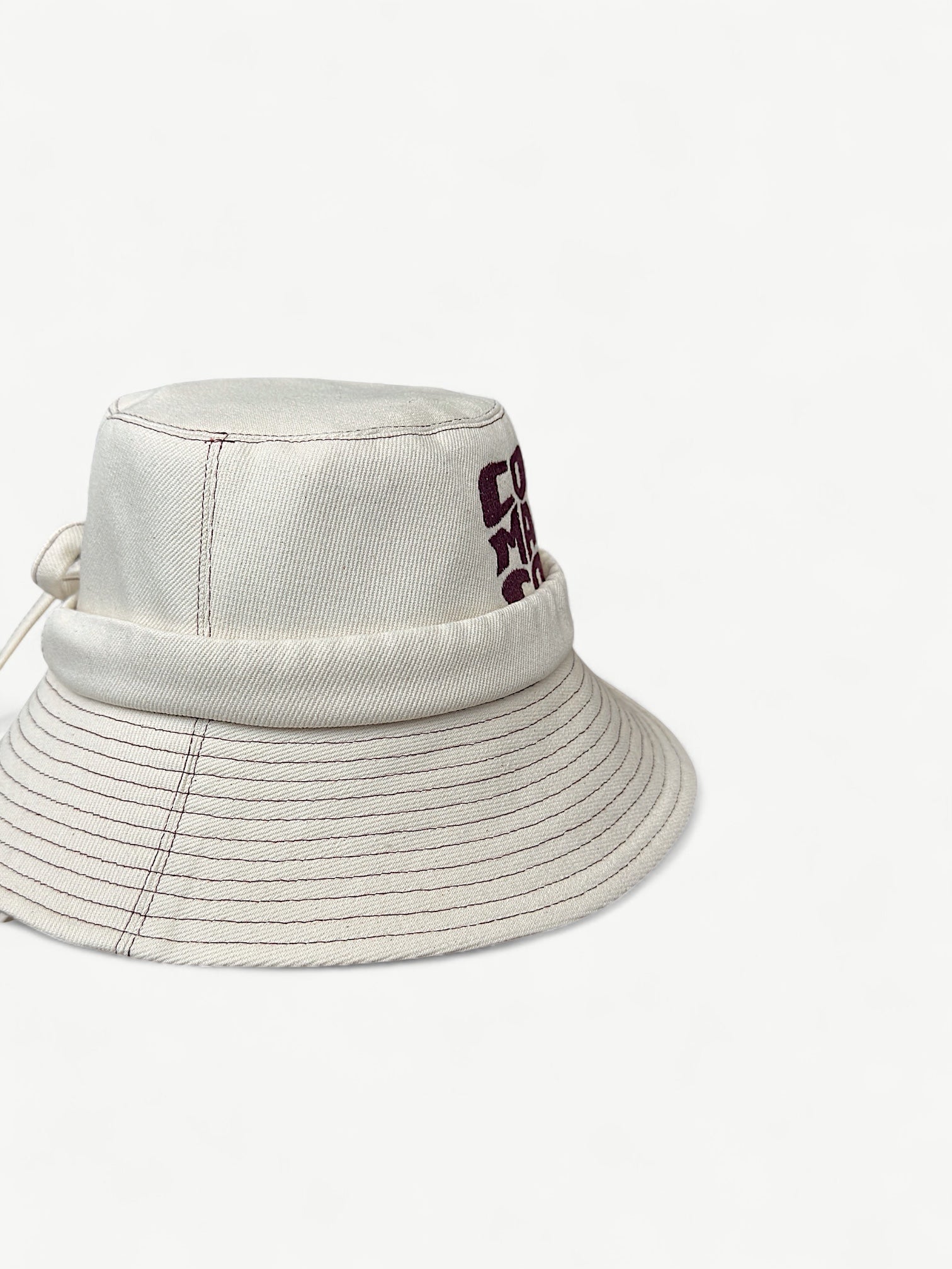 This hat comes in cream denim, embellished with a burgundy signature embroidery. A frayed stitched brim offers a proper level of sun protection. This hat is ONE SIZE, but you can adjust it at the back with the laces tied in a bow.