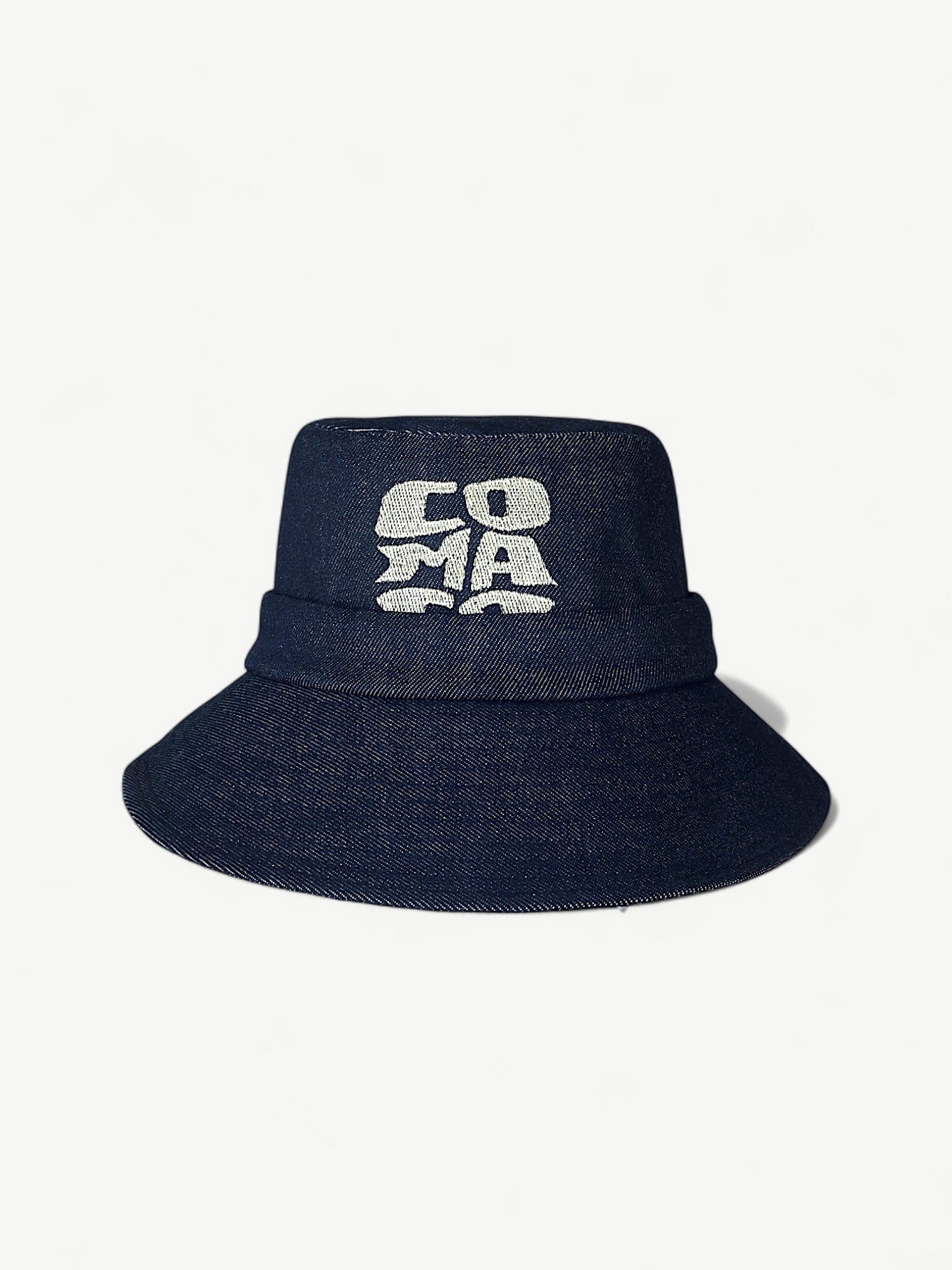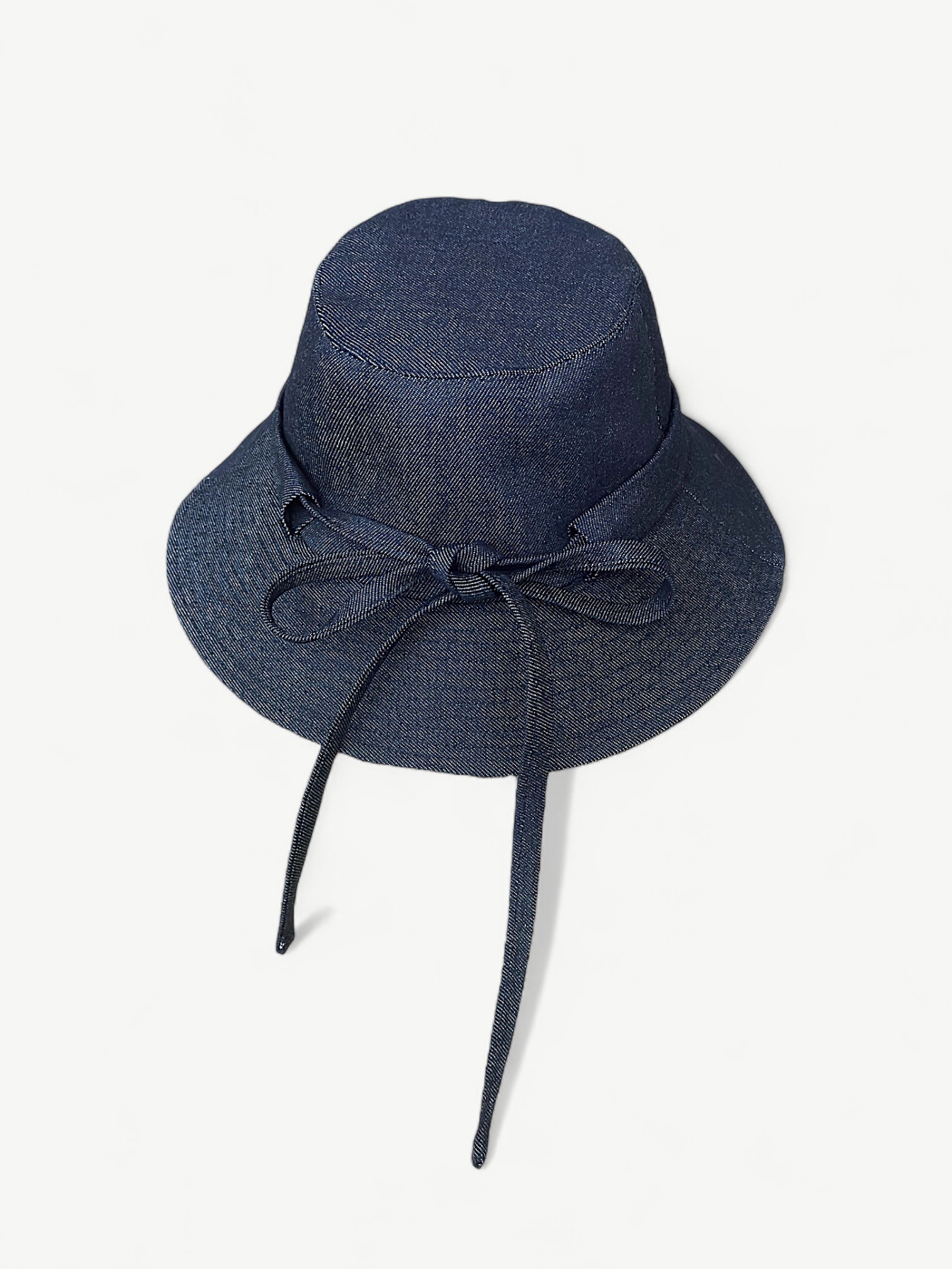 This hat comes in denim, embellished with a gold signature embroidery. A frayed stitched brim offers a proper level of sun protection. This hat is ONE SIZE, but you can adjust it at the back with the laces tied in a bow.