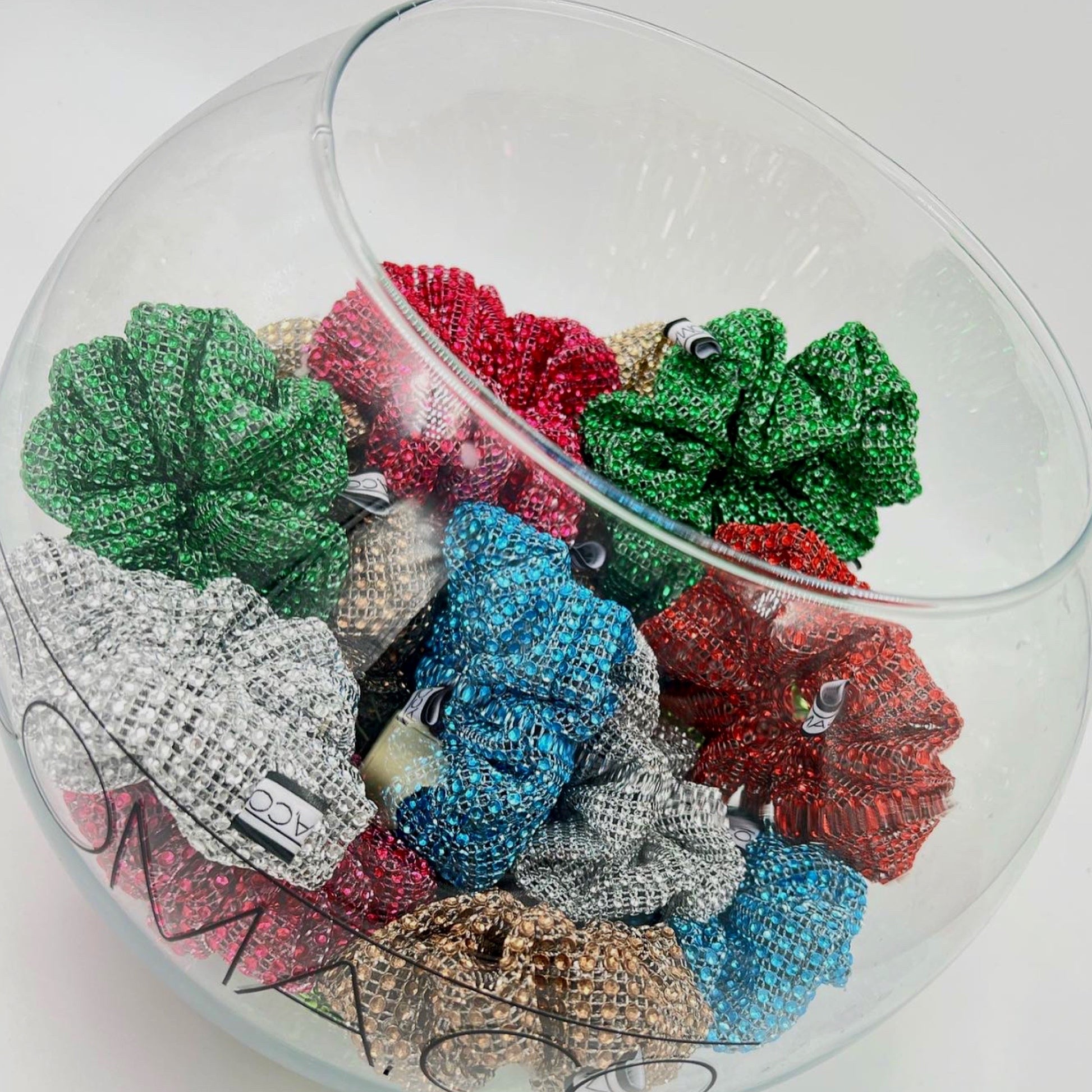 Limited Rhinestone Collection of 7 Colours, medium sized scrunchies, made of mesh with rhinestones effect. Perfect must have accessories for evening looks or pop of colour to your outfit.