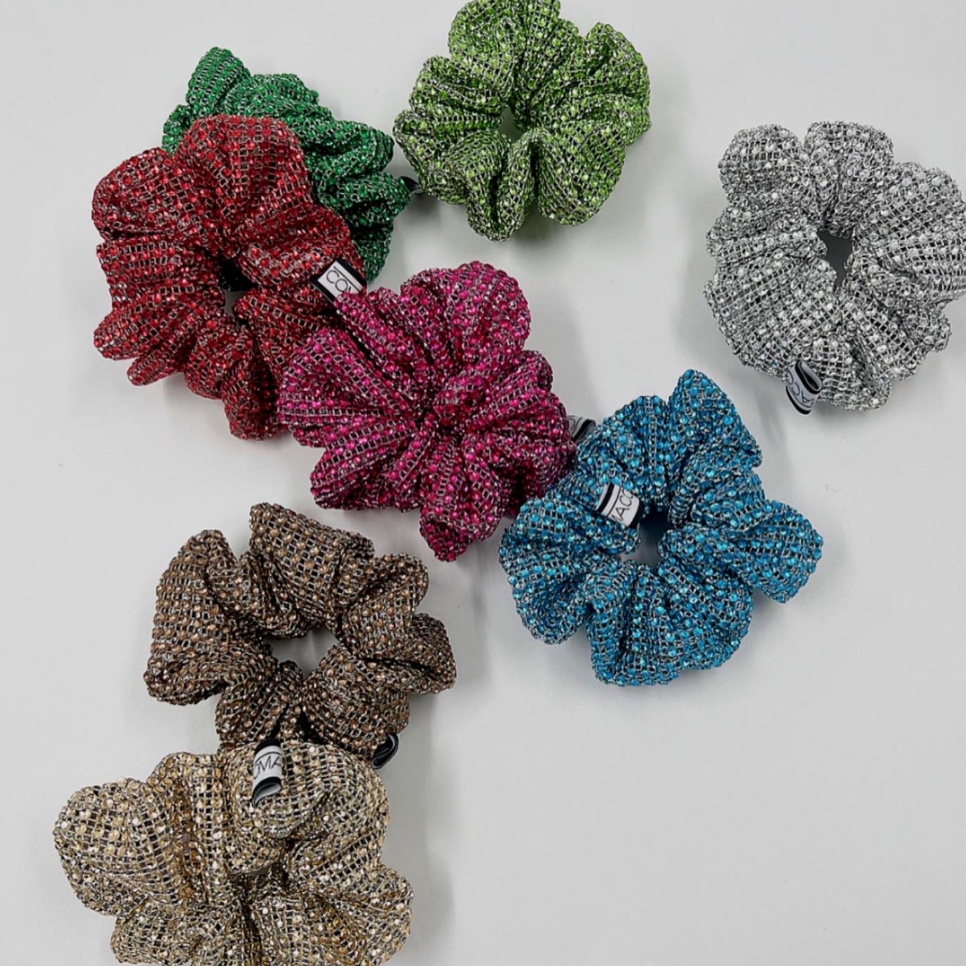 Limited Rhinestone Collection of 7 Colours, medium sized scrunchies, made of mesh with rhinestones effect. Perfect must have accessories for evening looks or pop of colour to your outfit.