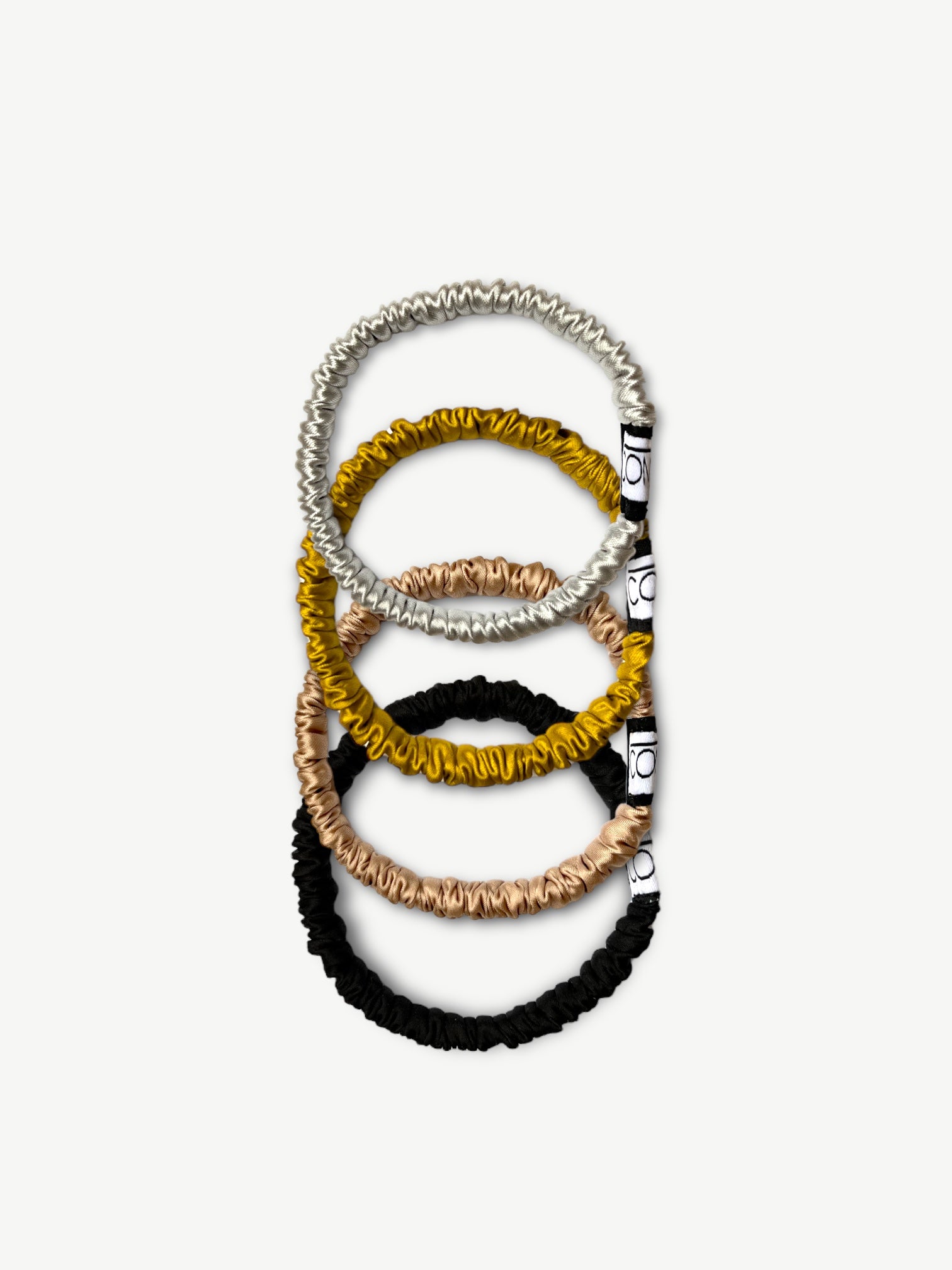 • This set includes: 1 x silver, 1 x black, 1 x mustard, 1 x nude skinny scrunchies.