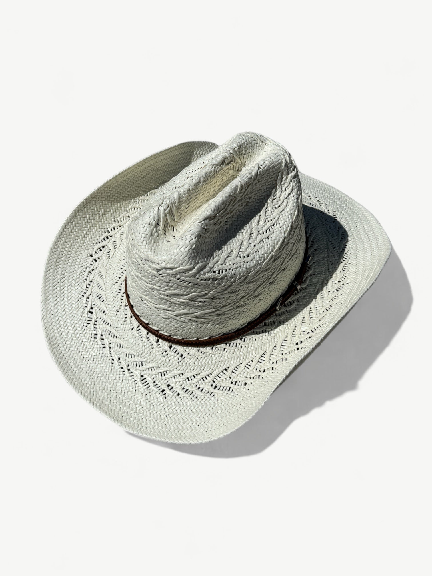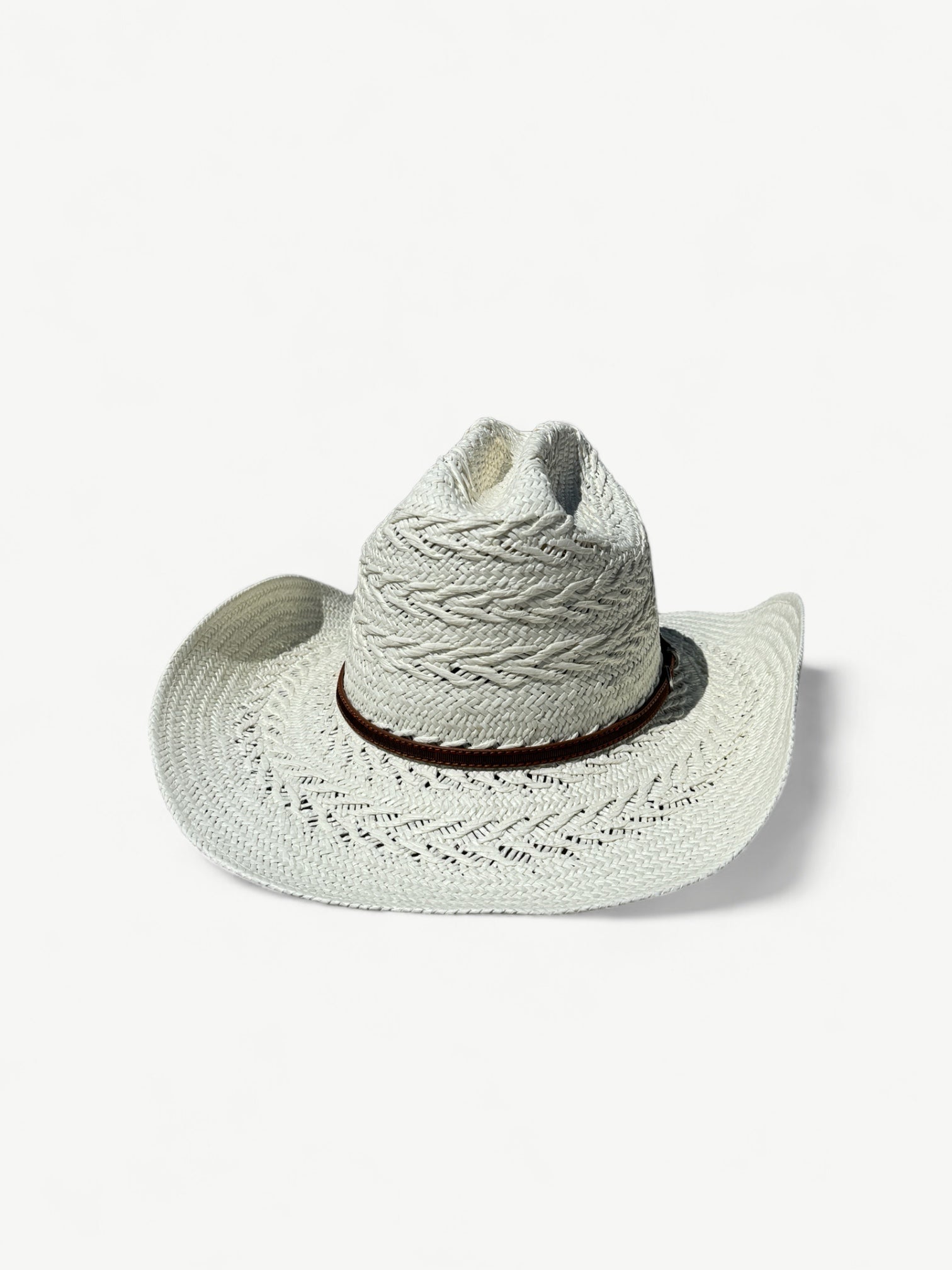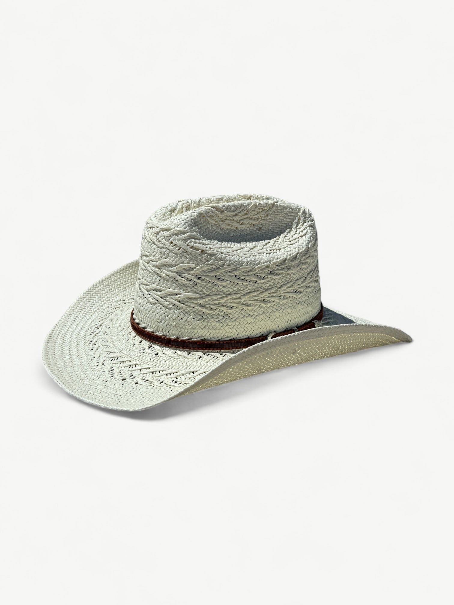 Western Cowboy Hat in white straw, with belt in tan color & silver buckle