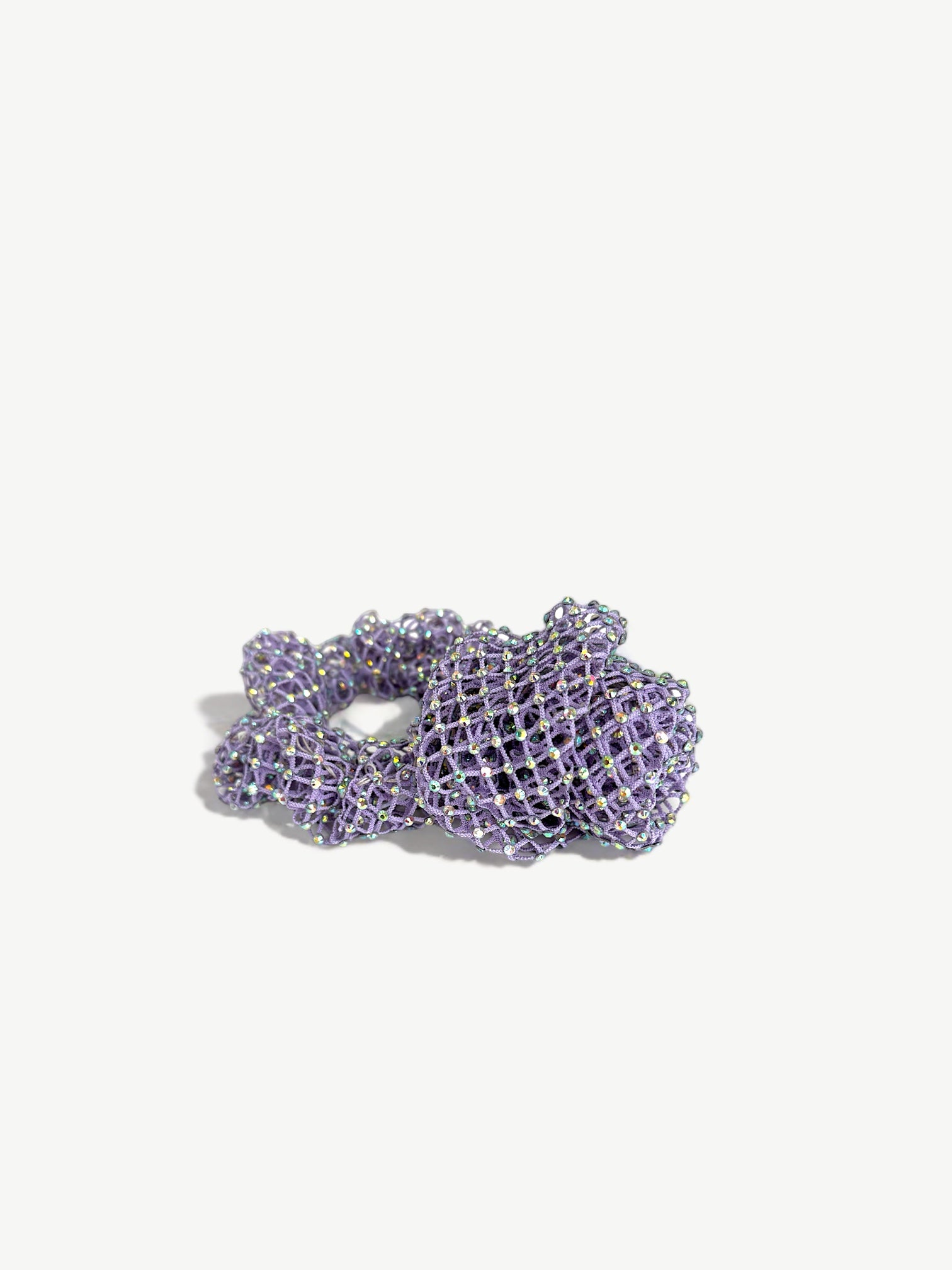 Our "ROSE" scrunchie is perfect to wear on your wrist, a top knot, or a simple ponytail. The ultimate must have, perfect for all festive activities! Each scrunchie is 100% handmade from rhinestone mesh with crystals in Lilac Colour.